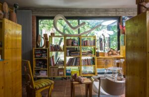 Elemento caratteristico della casa-studio è la permeabilità tra esterno ed esterno in quanto tutti gli spazi sono in diretta connessione tramite vetrate scorrevoli o porte finestre con il verde del giardino che cresce liberamente e circonda l’edificio. Tutte le vetrate della casa e dello studio sono potenziali ingressi dall’esterno.